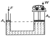 In a hydraulic jack as shown, mass of the car $W=800 \,kg , A_1=10 \,cm ^2, A_2=10 \,m ^2$. The minimum force $F$ required to lift the car is ........... $N$