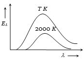 The adjoining diagram shows the spectral energy density distribution ${E_\lambda }$of a black body at two different temperatures. If the areas under the curves are in the ratio $16 : 1$ , the value of temperature $T$ is ........ $K$