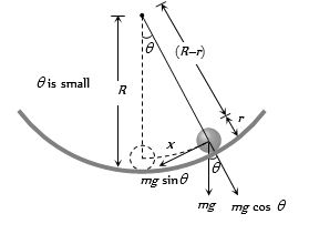 A sphere of radius $r$ is kept on a concave mirror of radius of curvature $R$. The arrangement is kept on a horizontal table (the surface of concave mirror is frictionless and sliding not rolling). If the sphere is displaced from its equilibrium position and left, then it executes $S.H.M.$ The period of oscillation will be