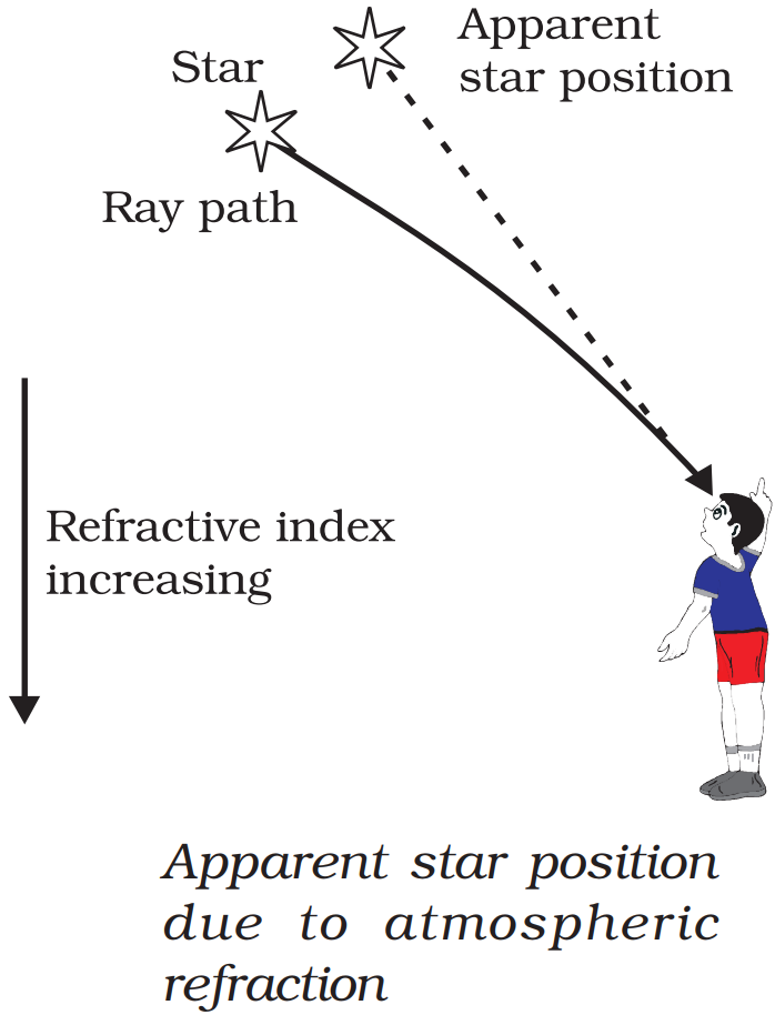 The gradual change in the refractive index of different layers of the atmosphere due to the varying conditions of it causes atmospheric refraction. When starlight enters the atmosphere, it gets refracted continuously. The higher level of air acts as a rarer medium while the dense air near the surface of earth acts as a denser medium. So, the atmosphere bends the starlight towards the normal. As a result, the apparent position of star is slightly different from its actual position. Thus, star appears slightly higher (above) than its actual position in the sky.