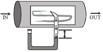 The Pitot tube shown in the figure is used to measure fluid flow velocity in a pipe of cross sectional area $S$. It was invented by a French engineer Henri Pitot in the early $18^{th}$ century. The volume of the gas flowing across the section of the pipe per unit time is (The difference in the liquid columns is $\Delta h, \rho_0$ and $\rho$ are the densities of liquid and the gas respectively) :-
