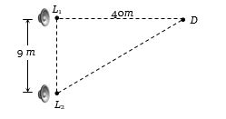 Two loudspeakers $L_1$ and $L_2$ driven by a common oscillator and amplifier, are arranged as shown. The frequency of the oscillator is gradually increased from zero and the detector at $D$ records a series of maxima and minima. If the speed of sound is $330\,ms^{-1}$ then the frequency at which the first maximum is observed is .... $Hz$