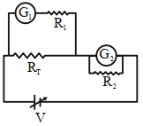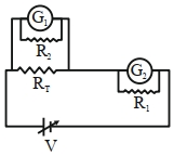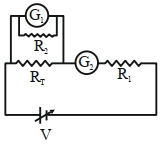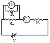 A student is provided with a variable voltage source $V$, a test resistor $R_T=10\,\Omega$, two identical galvanometers $G_1$ and $G_2$ and two additional resistors, $R _1=10\,M\,\Omega$ and $R _2=0.001\,\Omega$. For conducting an experiment to verify ohms law, the most suitable circuit is: