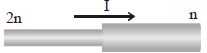 Two cylindrical rods of uniform crosssection area $A$ and $2A$, having free electrons per unit volume $2n$ and $n$ respectively are joined in series. A current $I$ flows through them in steady state. Then the ratio of drift velocity of free electron in left rod to drift velocity of electron in the right rod is $\left( {\frac{{{v_L}}}{{{v_R}}}} \right)$