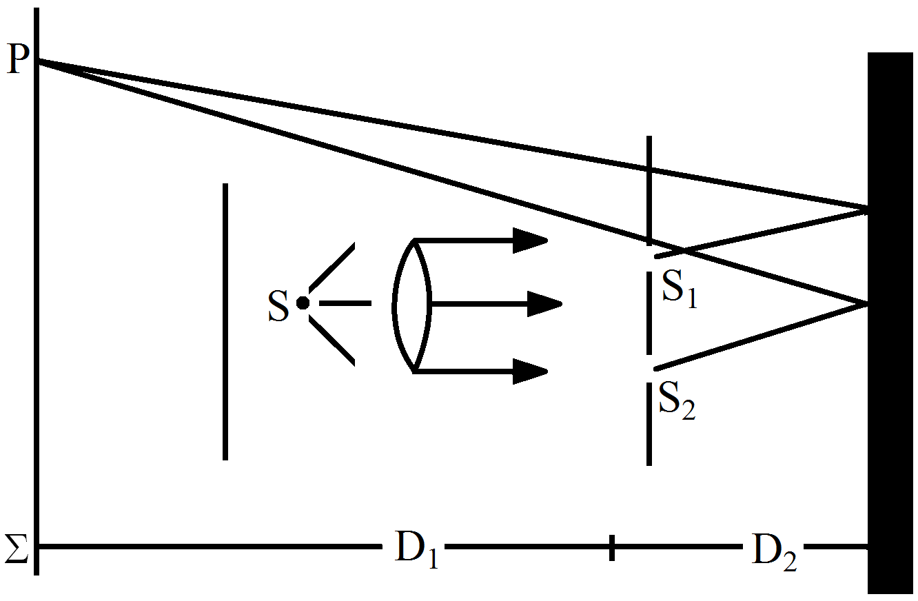 A double slit $S_1-S_2$ is illuminated by a coherent light of wavelength $\lambda$. The slits are separated by a distance $d$. A plane mirror is placed in front of the double slit at a distance $D_1$ from it and a screen $\sum$ is placed behind the double slit at a distance $D_2$ from it (figure $17-E_2$ ). The screen E receives only the light reflected by the mirror. Find the fringe-width of the interference pattern on the screen.