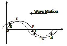 A transverse wave is travelling along a stretched string from right to left. The figure shown represents the shape of the string at a given instant. At this instant