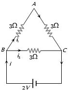Equivalent resistance $R = \frac{{3 \times (3 + 3)}}{{3 + (3 + 3)}} = 2\,\Omega $