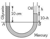 A vertical $U-$ tube of uniform inner cross section contains mercury in both sides of its arms. A glycerin (density = $1.3 g/cm^3$) column of length $10 $ $cm $ is introduced into one of its arms. Oil of density $0.8 gm/cm^3$ is poured into the other arm until the upper surfaces of the oil and glycerin are in the same horizontal level. Find the length of the oil column ........ $cm$. Density of mercury = $13.6 g/cm^3$