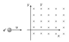 An electron moving with a speed $u$ along the positive $x-$axis at $y = 0$ enters a region of uniform magnetic field $\overrightarrow B = - {B_0}\hat k$ which exists to the right of $y$-axis. The electron exits from the region after some time with the speed $v$ at co-ordinate $y$, then