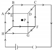A steady current is set up in a cubic network composed of wires of equal resistance and length $d$ as shown in figure. What is the magnetic field at the centre P due to the cubic network