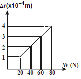The adjacent graph shows the extension $(\Delta l)$ of a wire of length $1\, m$ suspended from the top of a roof at one end and with a load $W$ connected to the other end. If the cross-sectional area of the wire is $10^{-6}\, m^2$, calculate the Young’s modulus of the material of the wire.