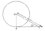 आकृति में, $AT$ केंद्र $O$ वाले वृत्त पर एक स्पर्श रेखा इस प्रकार है कि $OT = 4 \ cm$ और $\angle OTA = 30^\circ$ है। तब, $AT$ बराबर है