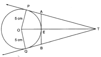 आकृति में, $O$ त्रिज्या $5 \ cm$ वाले वृत्त का केंद्र है, $T$ एक बिंदु इस प्रकार है कि $OT = 13 \ cm$ है तथा $OT$ वृत्त को $E$ पर प्रतिच्छेद करती है। यदि $AB,$ बिंदु $E$ पर वृत्त की एक स्पर्श रेखा है तो $AB$ की लंबाई ज्ञात कीजिए।