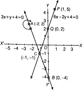 बिंदुओं $B(0, -4)$ और $A(-2,2)$ को आलेखित करने पर हमें सीधी रेखा $AB$ प्राप्त होती है। बिंदुओं $Q(0, 2)$ और $P(1, 5)$ को आलेखित करने पर हमें सीधी रेखा $PQ$ प्राप्त होती है। रेखाएँ $AB$ और $PQ, C (-1, -1)$ पर प्रतिच्छेद करती हैं।