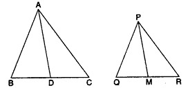 एक त्रिभुज ABC की भुजाएँ AB और AC तथा माध्यिका AD एक अन्य त्रिभुज की भुजाओं PQ और PR तथा माध्यिका PM के क्रमशः समानुपाती हैं। दर्शाइए कि$\triangle$ABC$\sim$$\triangle$PQR है।