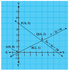 सारणी के हलों के संगत बिंदुओं A(0, 0), B(2, 1) और P(0, 5), Q(4, 2) को आलेखित कीजिए। अब समीकरणों x - 2y = 0 और 3x + 4y = 20 को निरूपित करने वाली रेखाओं AB तथा PQ को खींचिए, जैसा कि आकृति में दर्शाया गया है।