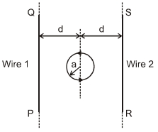 $2.$ Consider $d \gg a$, and the loop is rotated about its diameter parallel to the wires by $30^{\circ}$ from the position shown in the figure. If the currents in the wires are in the opposite directions, the torque on the loop at its new position will be (assume that the net field due to the wires is constant over the loop)