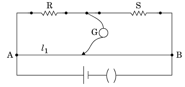 In a metre bridge, the balance point is found at a distance $l_1$ with resistances R and S as shown in the figure.