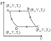 $\eta=\frac{\text { Work done }}{ Q _{\text {suppl. }}}=1-\frac{ Q _{\text {rej }}}{ Q _{\text {supp }}}=1-\frac{ n _{ C / P } \Delta T _{34}}{ n _{ C / P } \Delta T _{12}}$