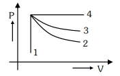 An ideal gas undergoes four different processes from the same initial state as shown in the figure below. Those processes are adiabatic, isothermal, isobaric and isochoric. The curve which represents the adiabatic process among $1,2,3$ and $4$ is