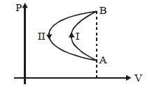 In a cyclic process, a gas is taken from state $A$ to $B$ via path $-I$ as shown in the indicator diagram and taken back to state $A$ from state $B$ via path $-II$ . In the complete cycle