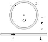 The field at $O$ due to straight part of conductor is ${B_1} = \frac{{{\mu _o}}}{{4\pi }}.\frac{{2i}}{r} \odot $. The field at $O$ due to circular coil is ${B_2} = \frac{{{\mu _0}}}{{4\pi }}.\frac{{2\pi i}}{r} \otimes $. Both fields will act in the opposite direction, hence the total field at $O$.