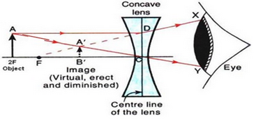 An object lies at a distance of 2f from a concave lens of focal length f. Draw a ray-diagram to illustrate the image formation.