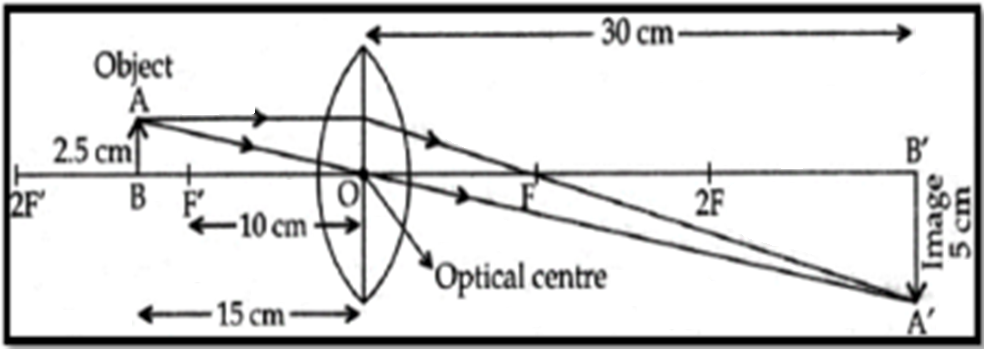 An object of height 2.5cm is placed at a distance of 15cm from the optical centre ‘O' of a convex lens of focal length 10cm. Draw a ray diagram to find the position and size of the image formed. Mark optical centre ‘O', principal focus F and height of the image on the diagram.