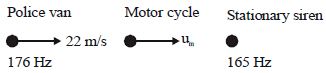 A police van, moving at $22\, m/s$ , chases a motor-cyclist. The police man sounds horn at $176\, Hz$ , while both of them move towards a stationary siren of frequency $165\, Hz$ as shown in the figure. If the motor-cyclist does not observe any beats, his speed must be .... $m/s$ (take the speed of sound $= 330\, m/s$ )