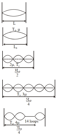 ($2$) The length of the string $1,2,3$ and 4 are kept fixed at $L _0, \frac{3 L _0}{2}, \frac{5 L _0}{4}$ and $\frac{7 L _0}{4}$, respectively. Strings $1,2,3$ and 4 are vibrated at their $1^{\text {tt }}, 3^{\text {rd }}, 5^{\text {m }}$ and $14^{\star}$ harmonics, respectively such that all the strings have same frequency. The correct match for the tension in the four strings in the units of $T _0$ will be.