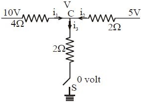 $\frac{10-V}{4}+\frac{5-V}{2}=\frac{V-0}{2}$