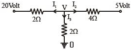 $\Rightarrow \frac{\mathrm{V}-20}{2}+\frac{\mathrm{V}-5}{4}+\frac{\mathrm{V}-0}{2}=0$