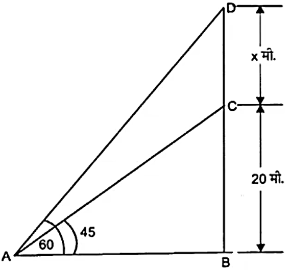 भूमि के एक बिंदु से एक $20 m$ ऊँचे भवन के शिखर पर लगी एक संचार मीनार के तल और शिखर के उन्नयन कोण क्रमशः $45^\circ$ और $60^\circ$ है। मीनार की ऊँचाई ज्ञात कीजिए।