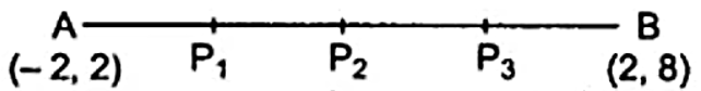 यहाँ, दिए गये बिन्दु हैं: $A(-2, 2)$ और $B(2, 8)$ माना $P_1, P_2$ और $P_3$ रेखाखंण्ड $AB$ को चार समान भागों में विभाजित करते हैं: