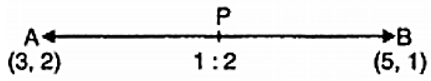 चूँकि, बिंदु A (3, 2) और B (5, 1) को मिलाने वाले रेखाखंड को बिंदु P पर 1:2 के अनुपात में विभाजित किया जाता है, इसलिए खंड सूत्र के अनुसार,