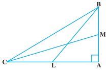 $BL$ और $CM$ एक समकोण त्रिभुज $\text{ABC}$ की माध्यिकाएँ हैं तथा इस त्रिभुज का कोण $A$ समकोण है। सिद्ध कीजिए कि $4(BL^2 + CM^2) = 5BC^2$