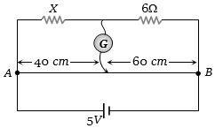 In the circuit shown, a meter bridge is in its balanced state. The meter bridge wire has a resistance $0.1\, ohm/cm$. The value of unknown resistance $X$ and the current drawn from the battery of negligible resistance is