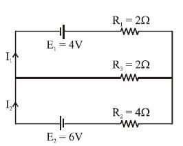 In the circuit shown below $E_1\, =4.0\, V$, $R_1\, = 2\,\Omega$, $E_2\, = 6.0\, V$, $R_2\, = 4\,\Omega$ and $R_3\, = 2\,\Omega$. The current $I_1$ is ............... $\mathrm{A}$
