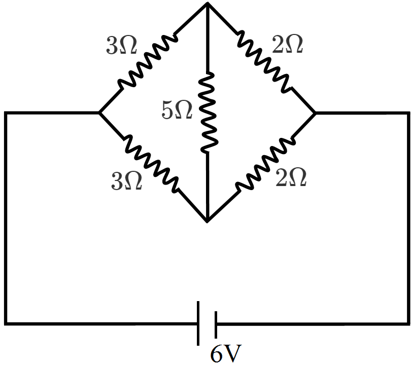 The equivalent circuit is as shown in figure alongside. [$\therefore$ Bridge is in balanced condition, no current flows through $5\Omega$ resistance] $\frac{1}{\text{R}}=\frac{1}{5}+\frac15\text{R}=5\Omega$