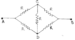 Also calculate the current through CD and ACB, if a 10 V d.c. source is connected between A and B, and the value of R is assumed as 2 Ω.