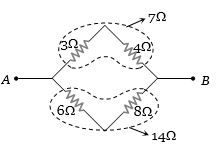 $ \Rightarrow \,\,\,\,\,\,{R_{eq}} = \frac{{7 \times 14}}{{(7 + 14)}} = \frac{{14}}{3}\Omega $.