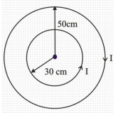 Two concentric circular loops of radii $r _{1}=30\,cm$ and $r_{2}=50\,cm$ are placed in $X - Y$ plane as shown in the figure. $A$ current $I=7\,A$ is flowing through them in the direction as shown in figure. The net magnetic moment of this system of two circular loops is approximately.