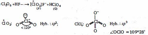 $C{l_2}{O_6}\left( l \right) + HF \to P + Q$ માં જો $HF$ નો ઍસિડ $H$ એ $Q$ સાથે જોડાય છે ત્યારબાદ $Cl-$ પરમાણુ નું સંકરણ અને $P$ અને $Q$ આયન ની અંદર $\angle OClO$