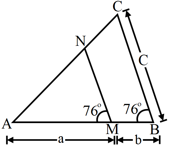 In the given figure, $\angle\text{AMN}=\angle\text{MBC}=76^\circ.$ If p, q and r are the lengths of AM, MB and BC respectively then express the length of MN in terms of p, q and r.