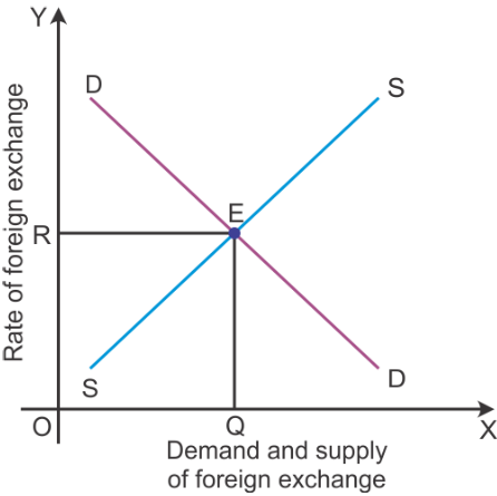 According to the graph, the equilibrium is determined at Point E, where the demand curve DD intersects the supply curve SS. Here, the equilibrium exchange rate is OR and the equilibrium quantity of foreign exchange is OQ.