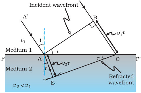A plane wavefront $A B$ is incident in rarer medium at instant $t=0$ on interface $X Y$ separating it from a denser medium. When wavelet $A$ is on interface, $B$ is at a distance $B B$, from it. It takes $t$ time to cover the distance $B B_1=v_1 t$ $=$ to reach on interface $X Y$. Mean while, the wavelet from $A$ reaches to point $A_1$ covering a distance $A A_1=v_2 t$ in denser medium.