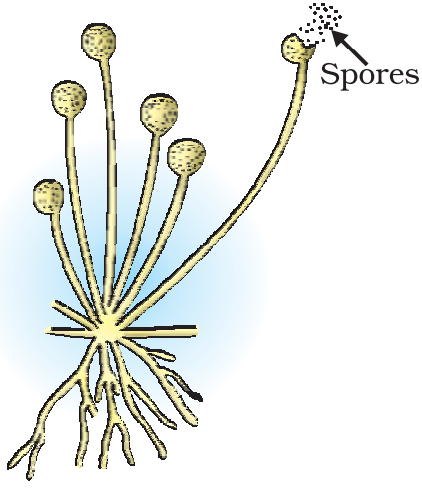 Rhizopus reproduces by spore formation which is a type of asexual reproduction. It contains tiny blob-on-a stick-like structures which are involved in reproduction. The blobs are sporangia which contain spores which are covered by thick walls that protect them until they come in contact with moist surface and can begin to grow.