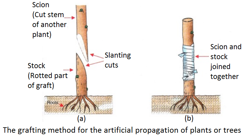 In grafting, two plants are chosen which are used as scion and stock. First the stem is removed from the plant chosen to be made scion by giving a slanting cut. The scion is placed over the stock and is fitted together by binding tightly by a piece of cloth or plastic sheet. The cut soon heals and the stock and scion of two plants grow together to become one plant.