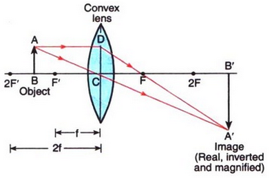 When an object is placed beyond 2f in front of a convex lens, then the image formed is between f and 2f on the other side of the lens, it is real, inverted and smaller than the object.