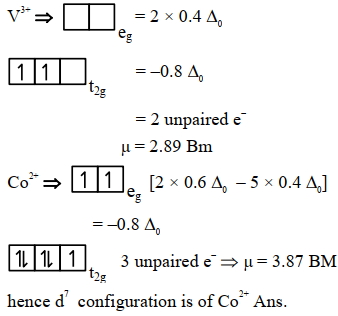 ધાતુ આયનના અષ્ટફલકીય એક્વા સંકીર્ણની સ્ફટિક ક્ષેત્ર સ્થાયીકરણ ઊર્જા $(CFSE)$ અને ચુંબકીય ચાક્માત્રા (માત્ર સ્પિન) અનુક્રમે $\left({M}^{2+}\right)$ $-0.8\, \Delta_{0}$ અને $3.87\, {BM}$ છે. $\left({M}^{Z+}\right)$ શોધો.